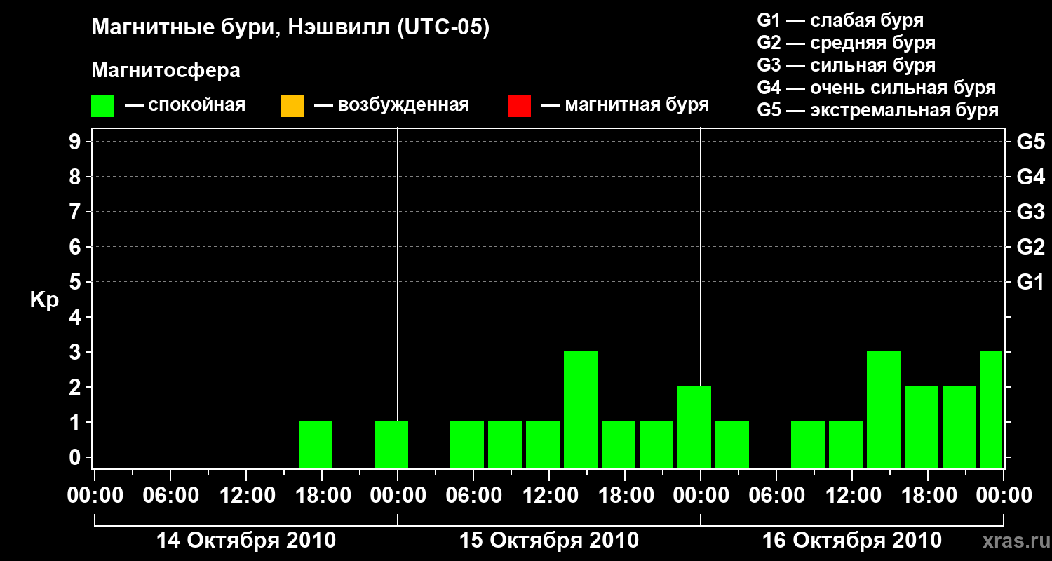 Изменения геомагнитного индекса Kp с 14 по 16 октября 2010 года для средних широт