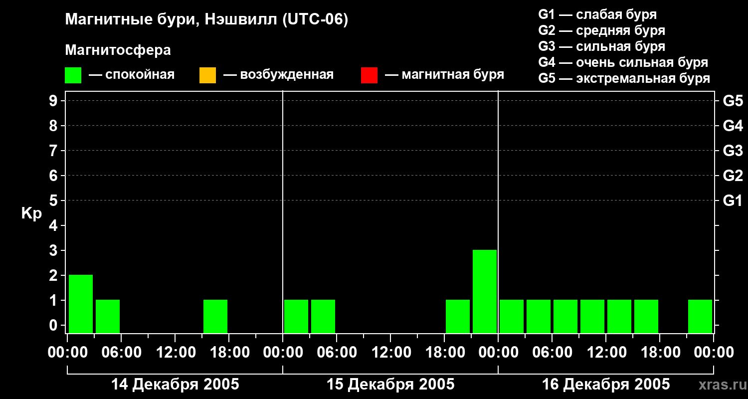 Изменения геомагнитного индекса Kp с 14 по 16 декабря 2005 года для средних широт