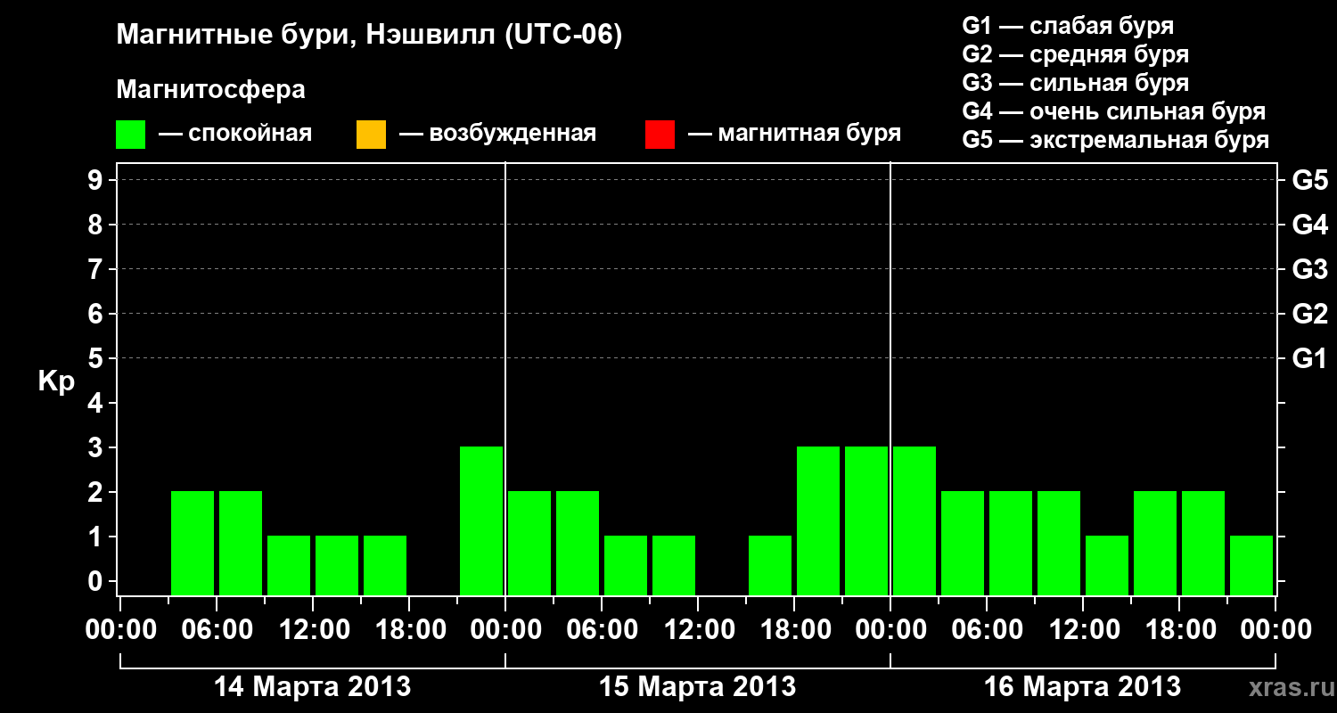 Изменения геомагнитного индекса Kp с 14 по 16 марта 2013 года для средних широт