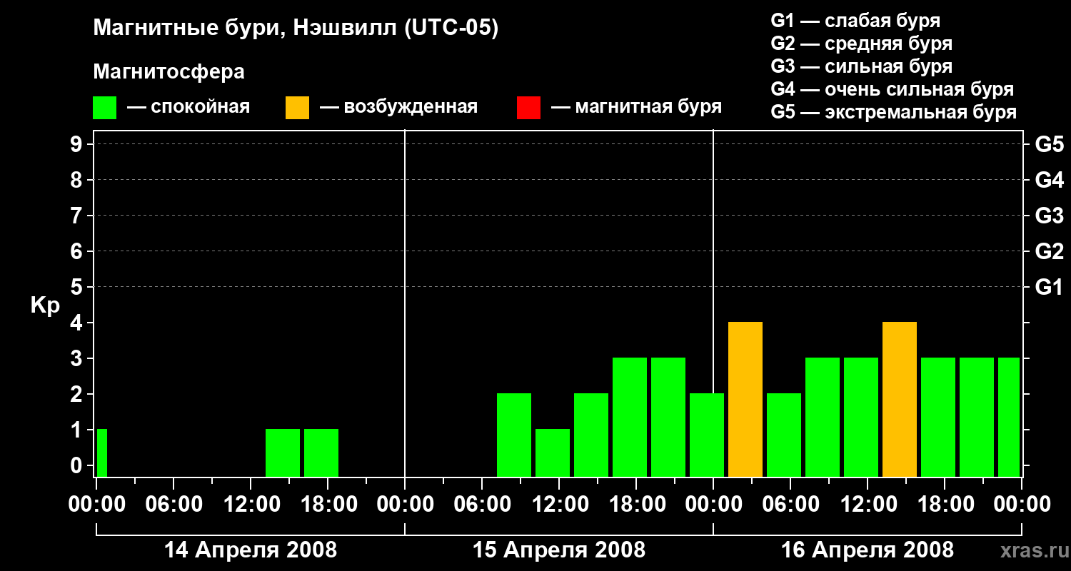 Изменения геомагнитного индекса Kp с 14 по 16 апреля 2008 года для средних широт