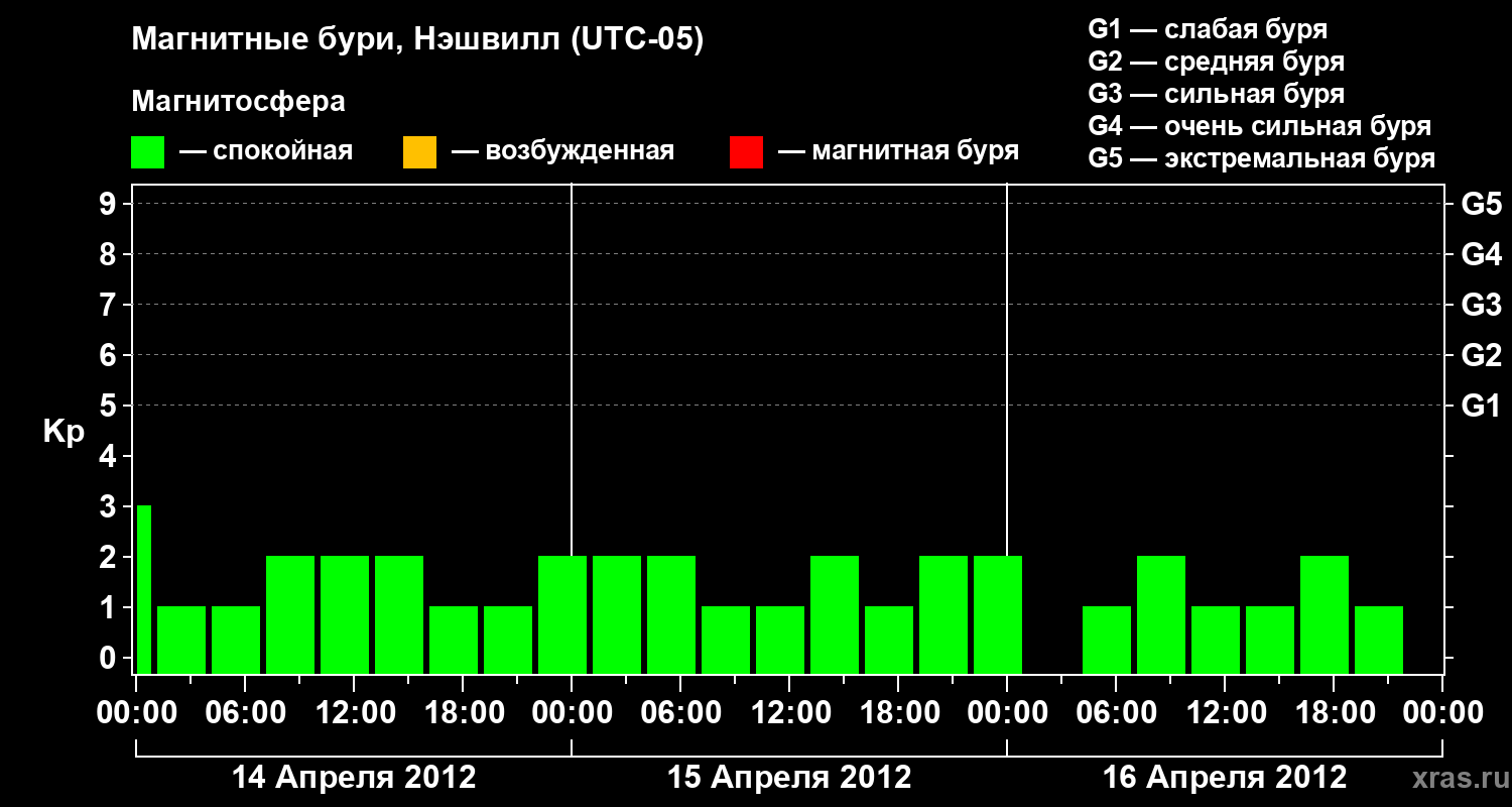 Изменения геомагнитного индекса Kp с 14 по 16 апреля 2012 года для средних широт