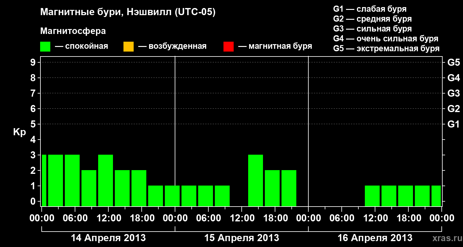Изменения геомагнитного индекса Kp с 14 по 16 апреля 2013 года для средних широт
