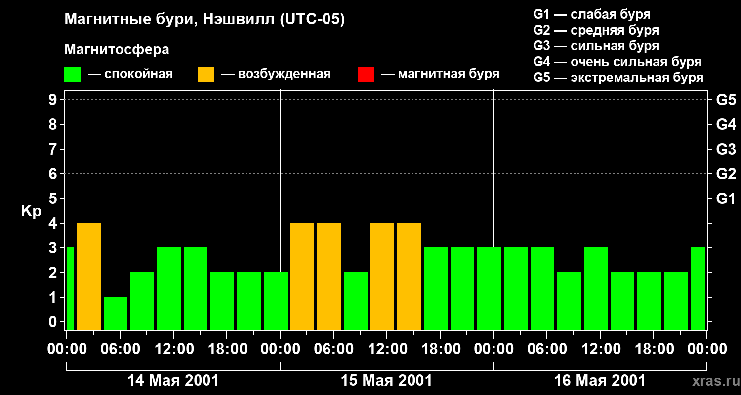 Изменения геомагнитного индекса Kp с 14 по 16 мая 2001 года для средних широт
