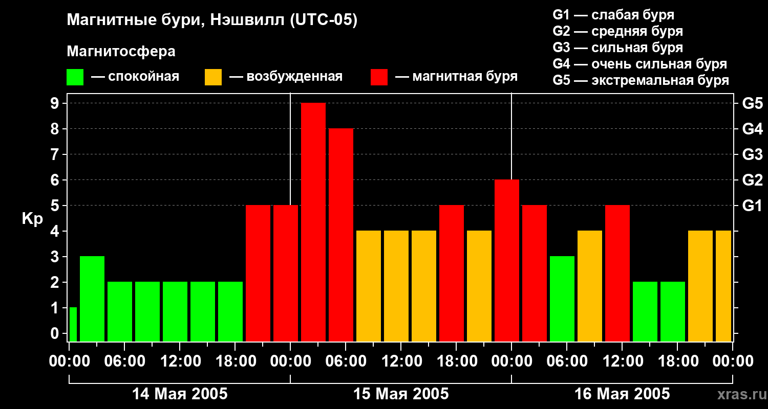 Изменения геомагнитного индекса Kp с 14 по 16 мая 2005 года для средних широт