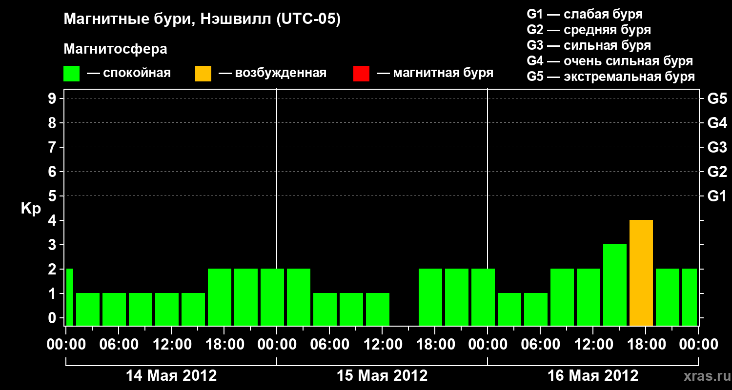 Изменения геомагнитного индекса Kp с 14 по 16 мая 2012 года для средних широт