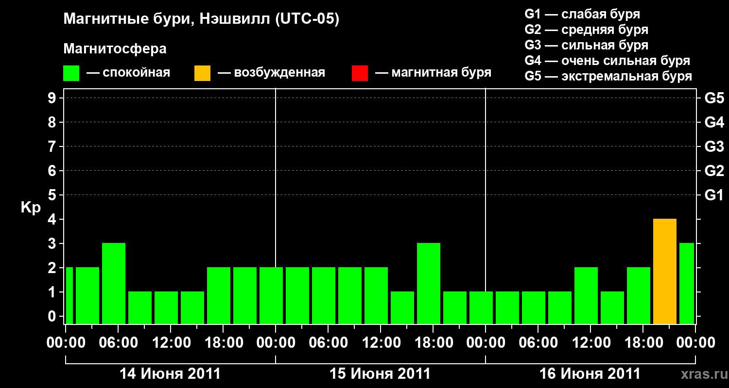 Изменения геомагнитного индекса Kp с 14 по 16 июня 2011 года для средних широт
