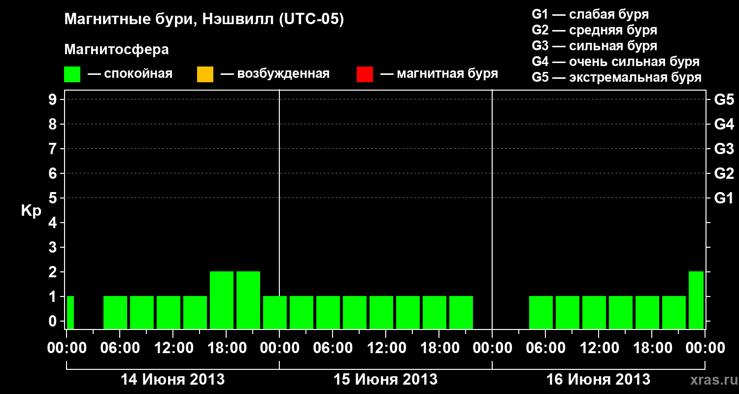 Изменения геомагнитного индекса Kp с 14 по 16 июня 2013 года для средних широт