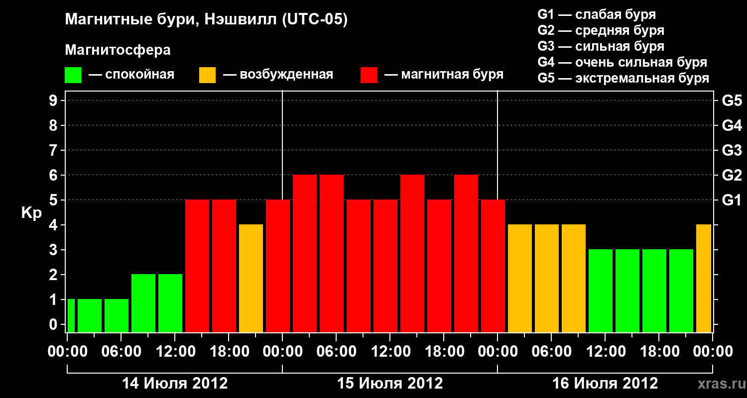 Изменения геомагнитного индекса Kp с 14 по 16 июля 2012 года для средних широт