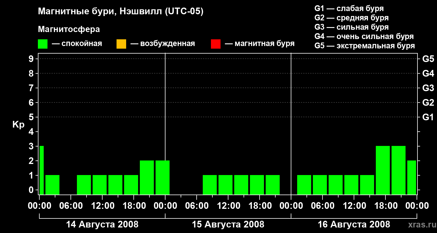 Изменения геомагнитного индекса Kp с 14 по 16 августа 2008 года для средних широт