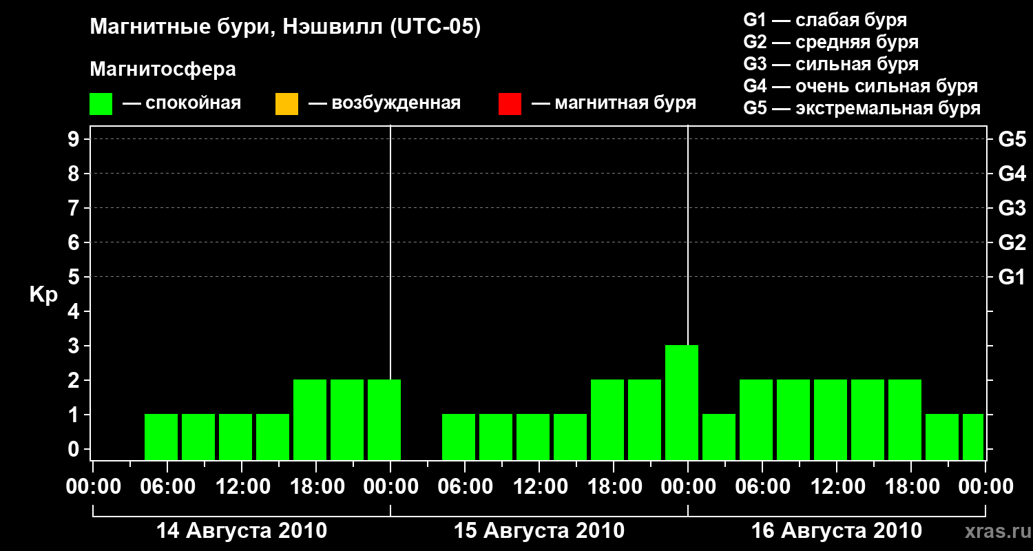 Изменения геомагнитного индекса Kp с 14 по 16 августа 2010 года для средних широт