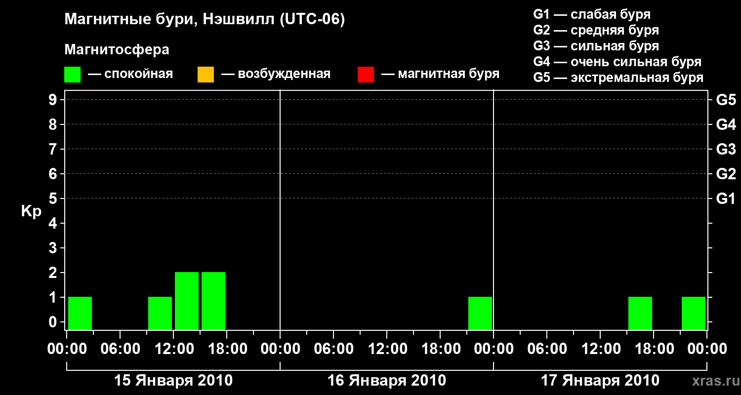 Изменения геомагнитного индекса Kp с 15 по 17 января 2010 года для средних широт