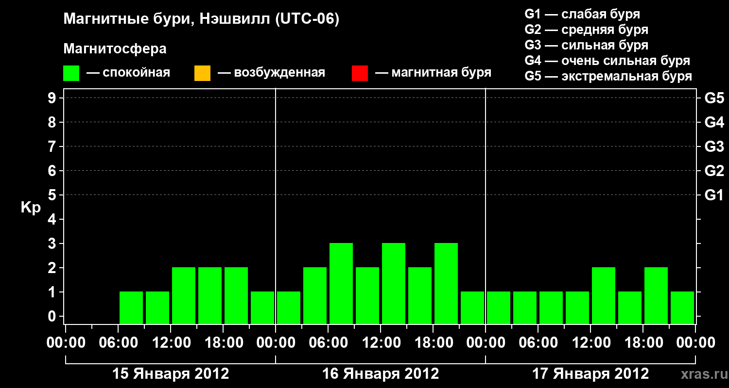 Изменения геомагнитного индекса Kp с 15 по 17 января 2012 года для средних широт