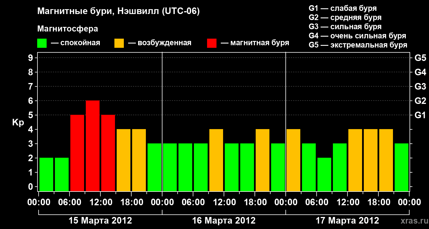 Изменения геомагнитного индекса Kp с 15 по 17 марта 2012 года для средних широт