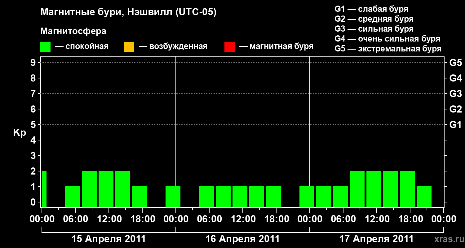 Изменения геомагнитного индекса Kp с 15 по 17 апреля 2011 года для средних широт