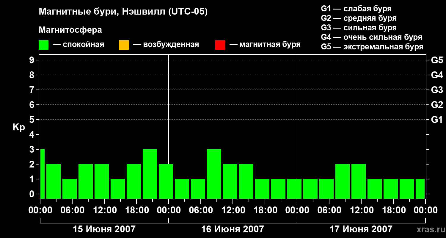 Изменения геомагнитного индекса Kp с 15 по 17 июня 2007 года для средних широт