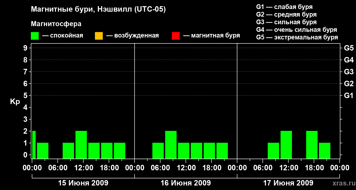 Изменения геомагнитного индекса Kp с 15 по 17 июня 2009 года для средних широт