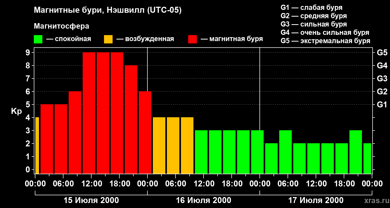 Изменения геомагнитного индекса Kp с 15 по 17 июля 2000 года для средних широт