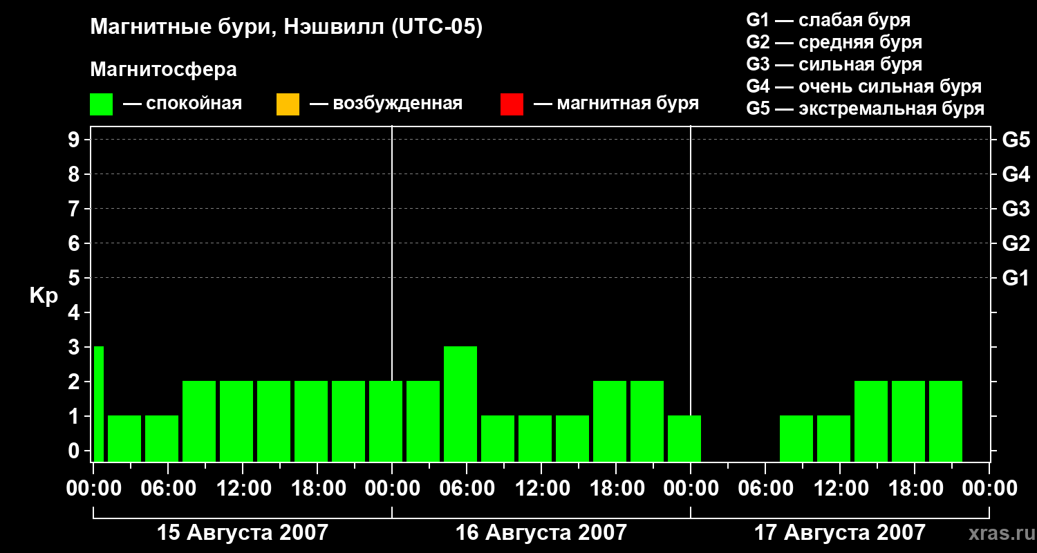 Изменения геомагнитного индекса Kp с 15 по 17 августа 2007 года для средних широт