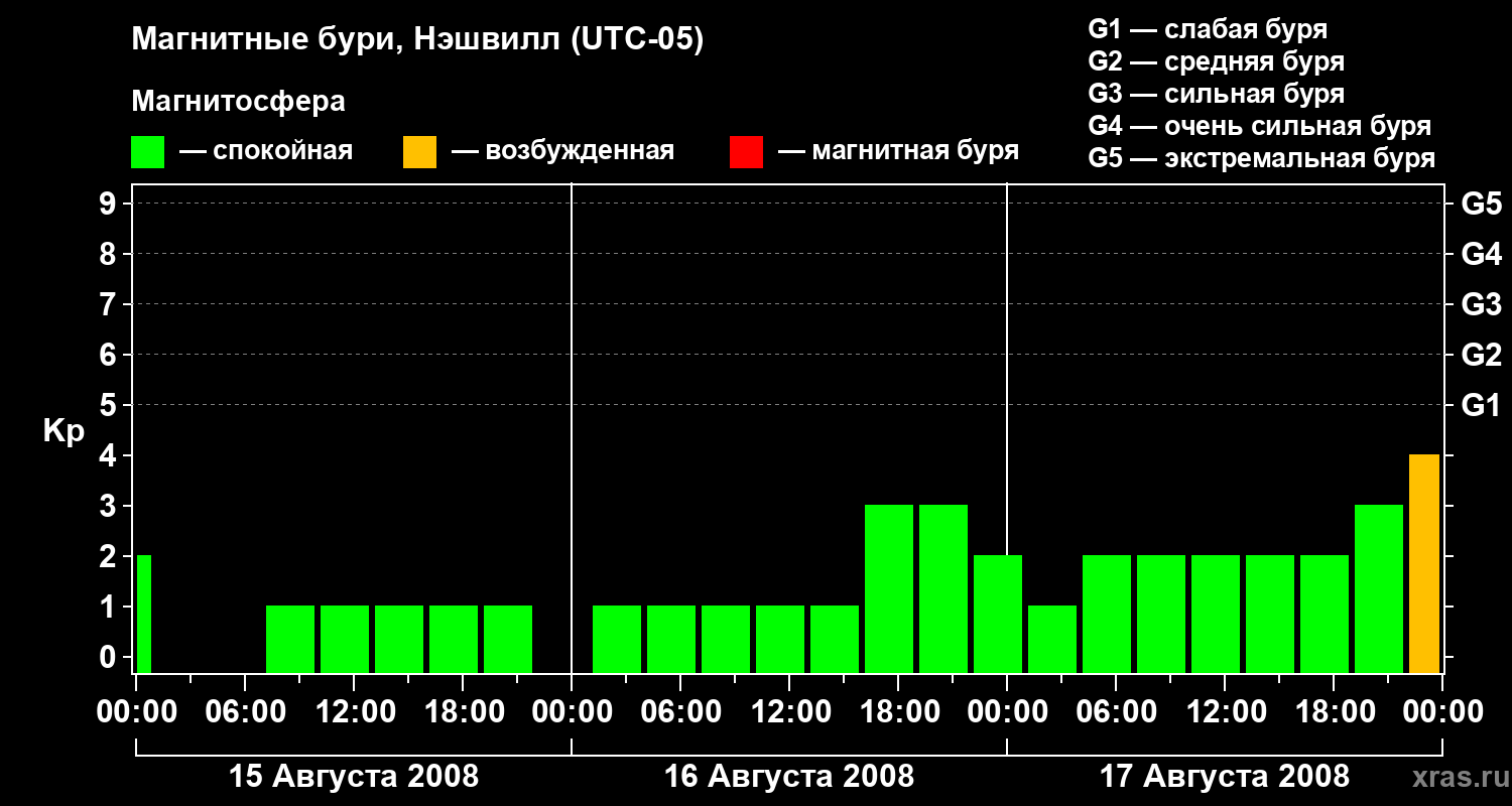 Изменения геомагнитного индекса Kp с 15 по 17 августа 2008 года для средних широт