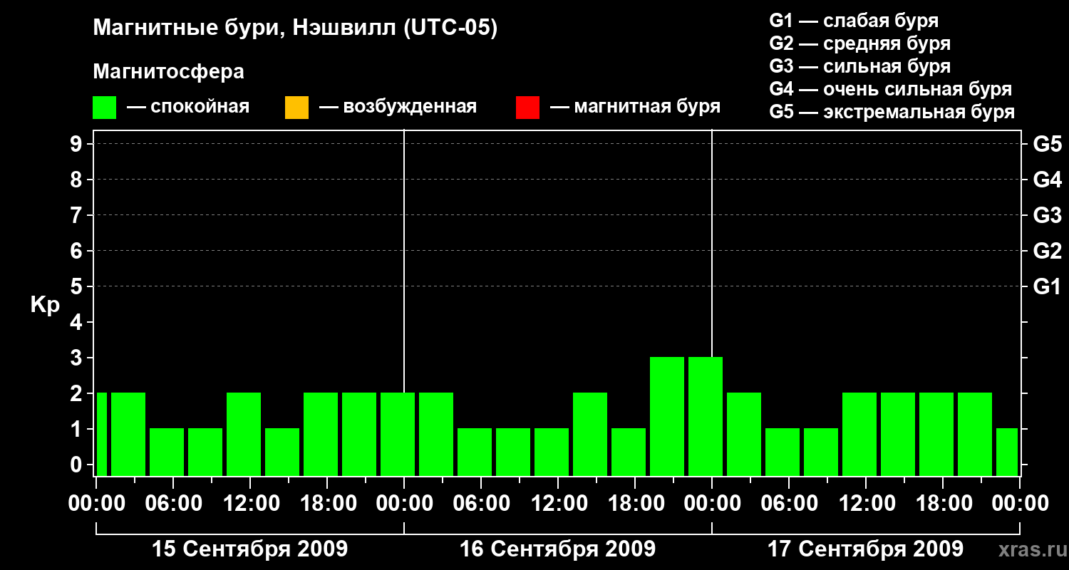 Изменения геомагнитного индекса Kp с 15 по 17 сентября 2009 года для средних широт