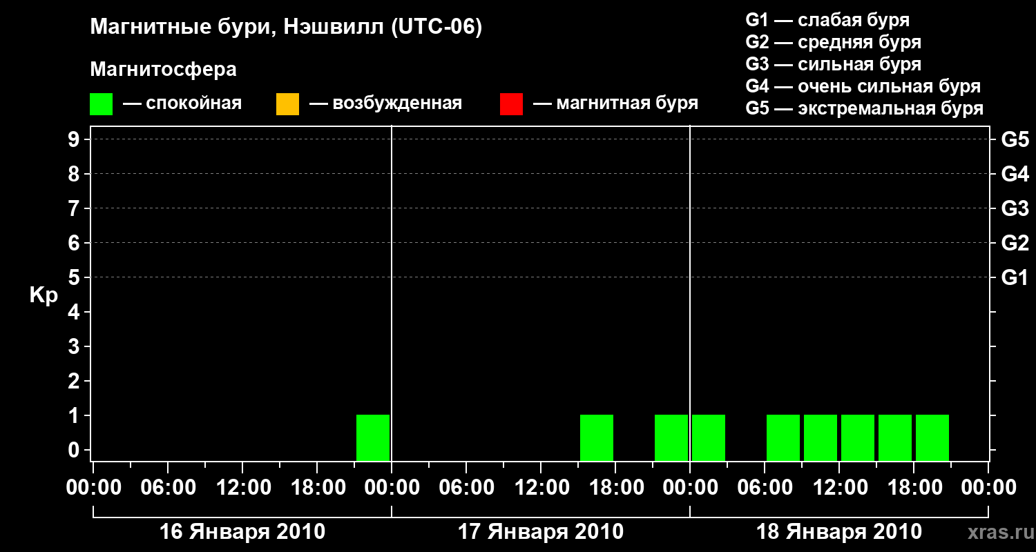 Изменения геомагнитного индекса Kp с 16 по 18 января 2010 года для средних широт