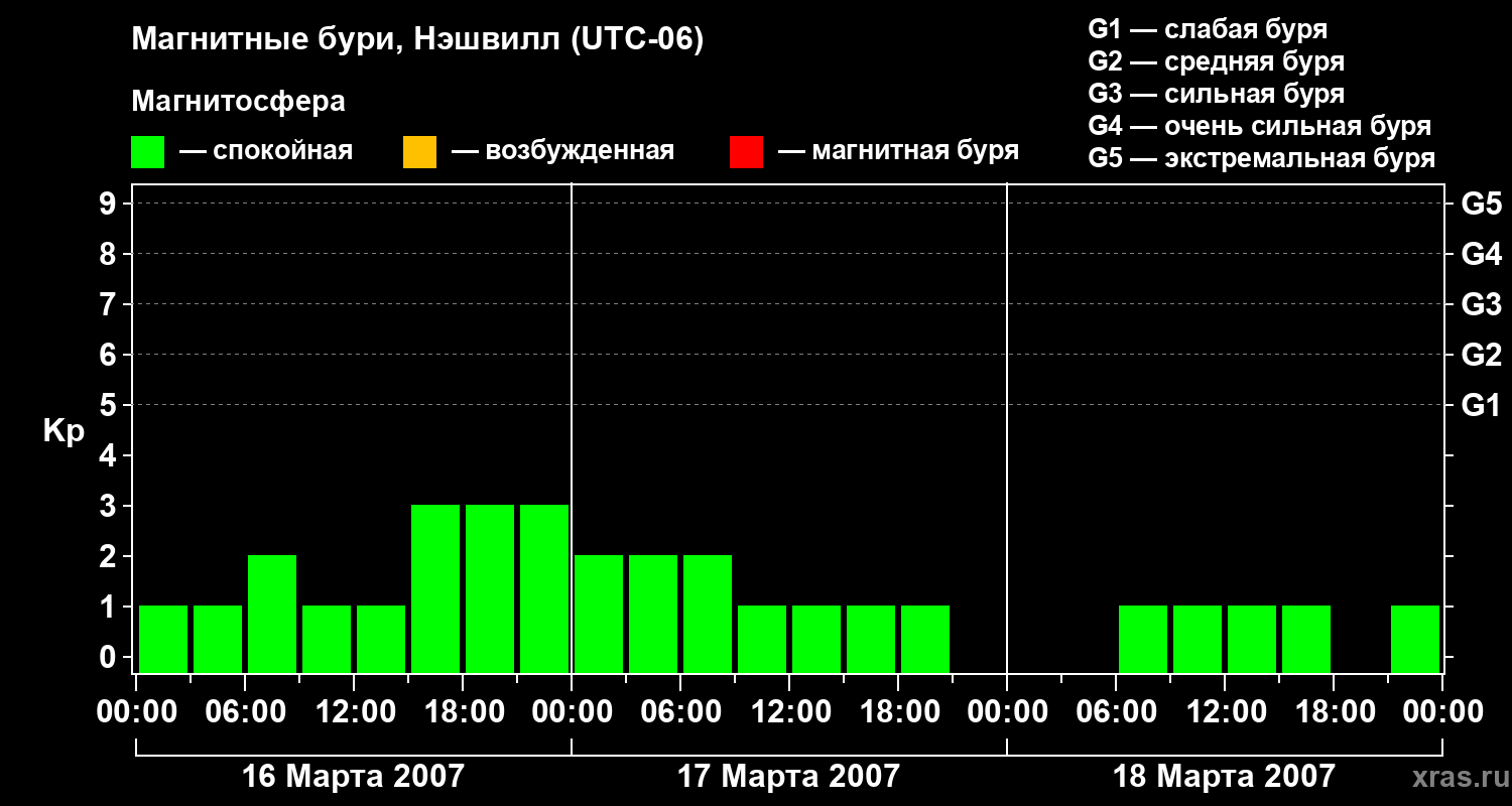 Изменения геомагнитного индекса Kp с 16 по 18 марта 2007 года для средних широт