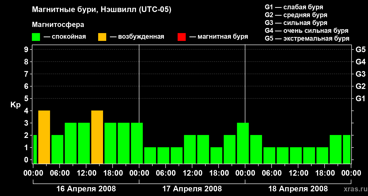 Изменения геомагнитного индекса Kp с 16 по 18 апреля 2008 года для средних широт