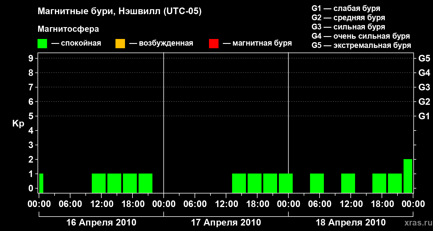 Изменения геомагнитного индекса Kp с 16 по 18 апреля 2010 года для средних широт