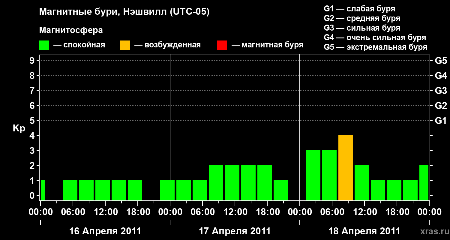 Изменения геомагнитного индекса Kp с 16 по 18 апреля 2011 года для средних широт