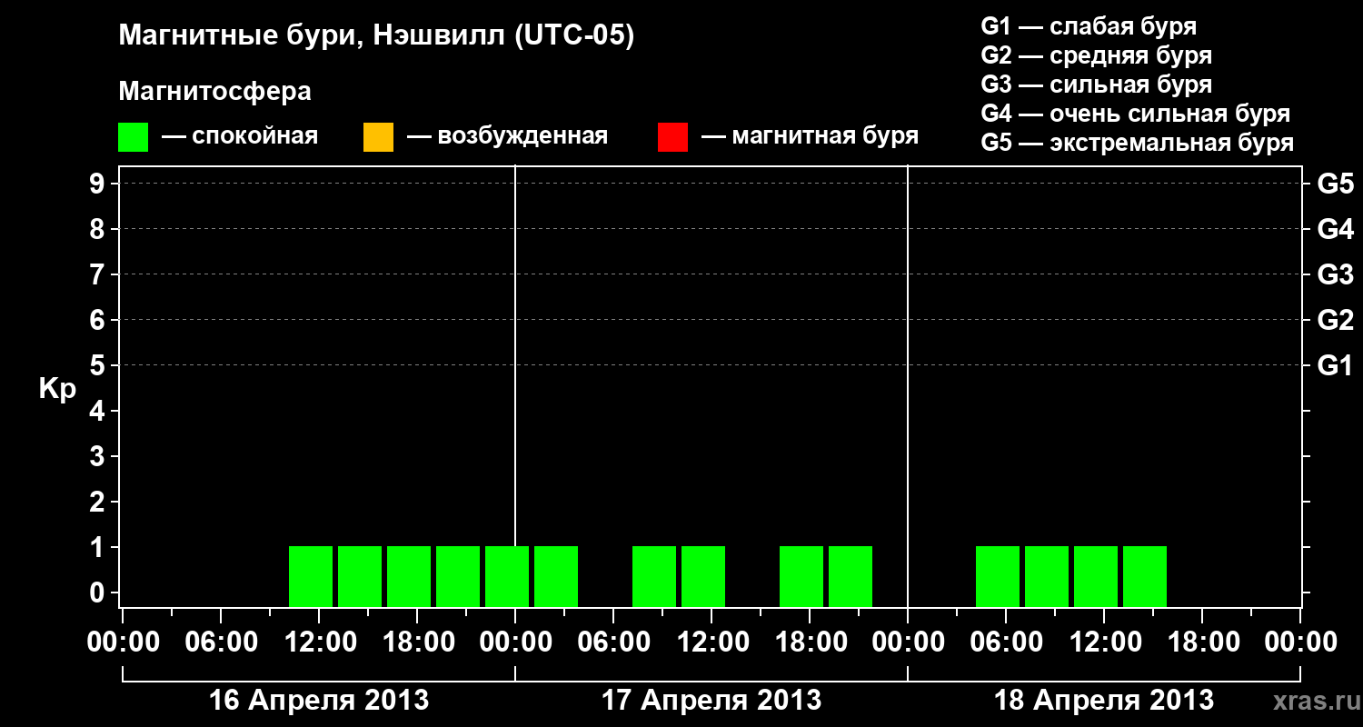 Изменения геомагнитного индекса Kp с 16 по 18 апреля 2013 года для средних широт