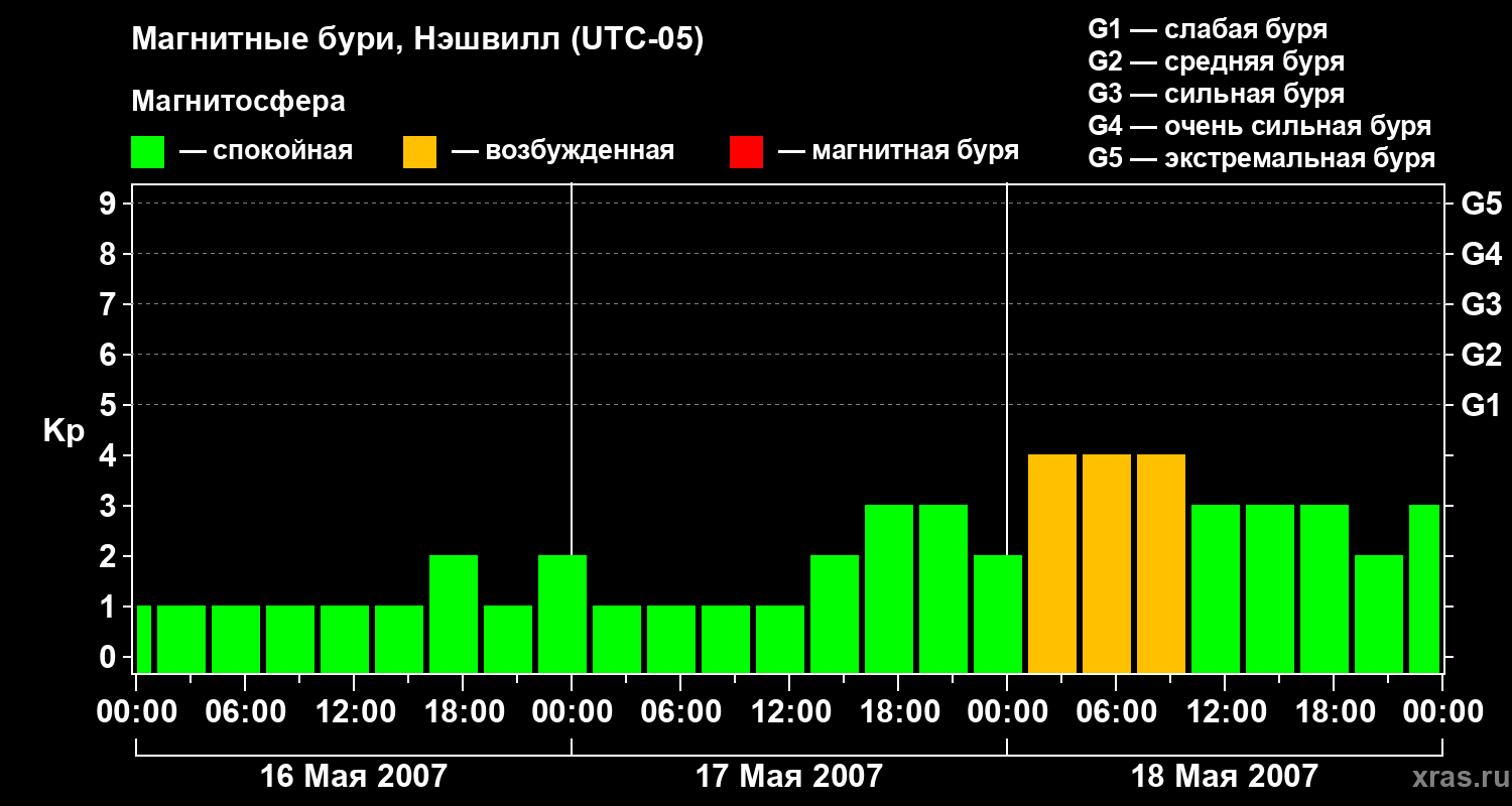 Изменения геомагнитного индекса Kp с 16 по 18 мая 2007 года для средних широт