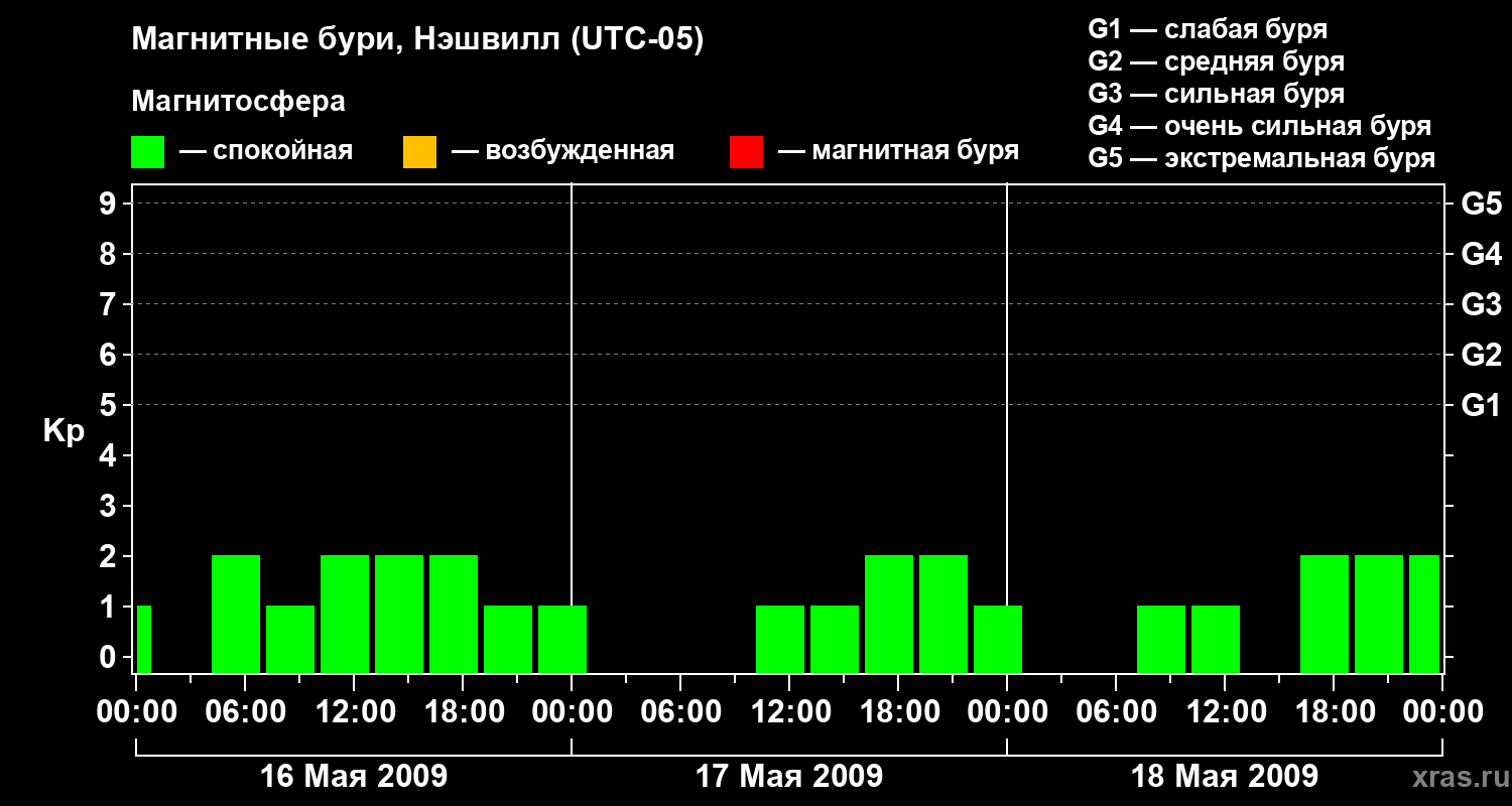Изменения геомагнитного индекса Kp с 16 по 18 мая 2009 года для средних широт