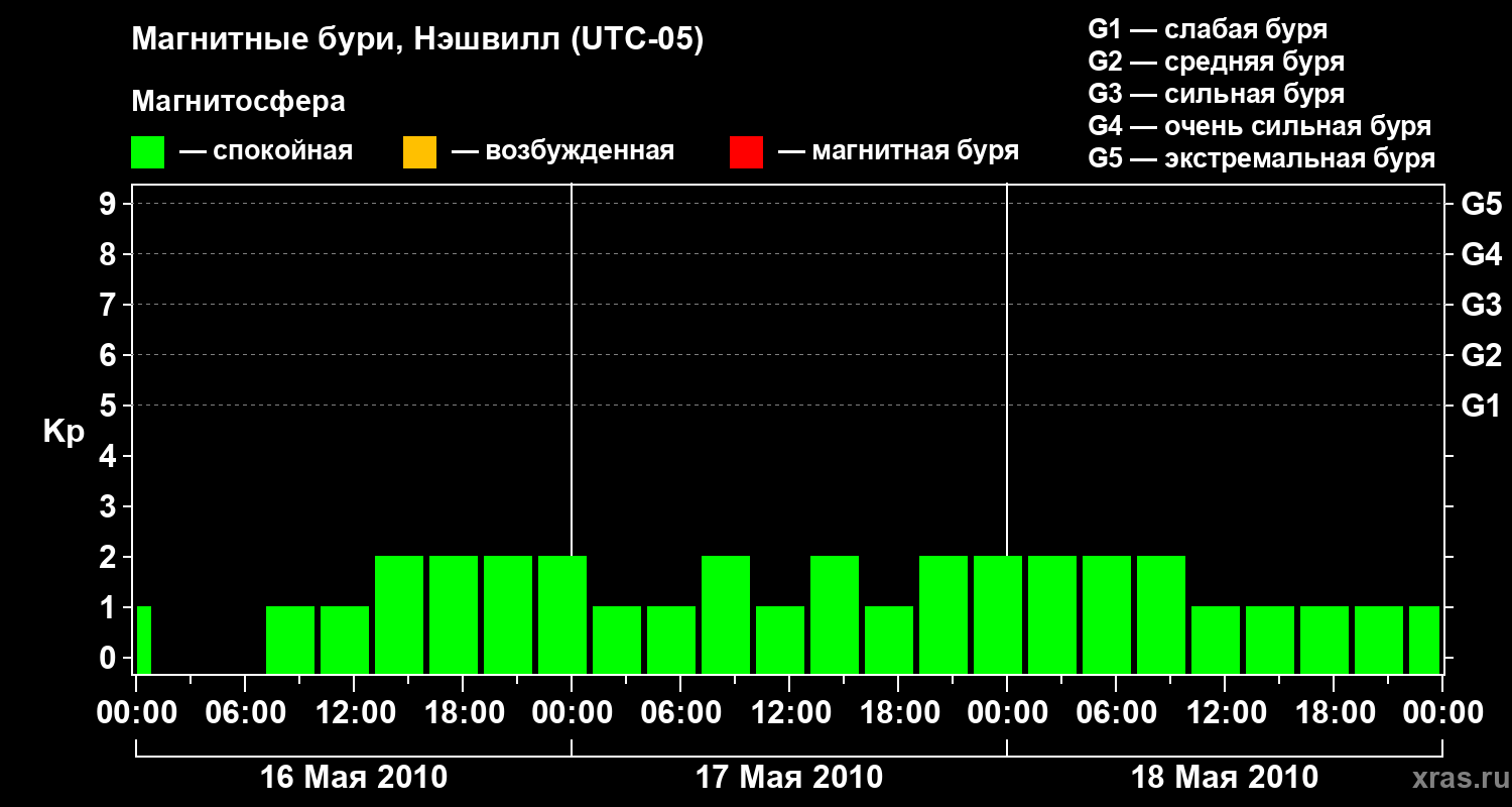 Изменения геомагнитного индекса Kp с 16 по 18 мая 2010 года для средних широт