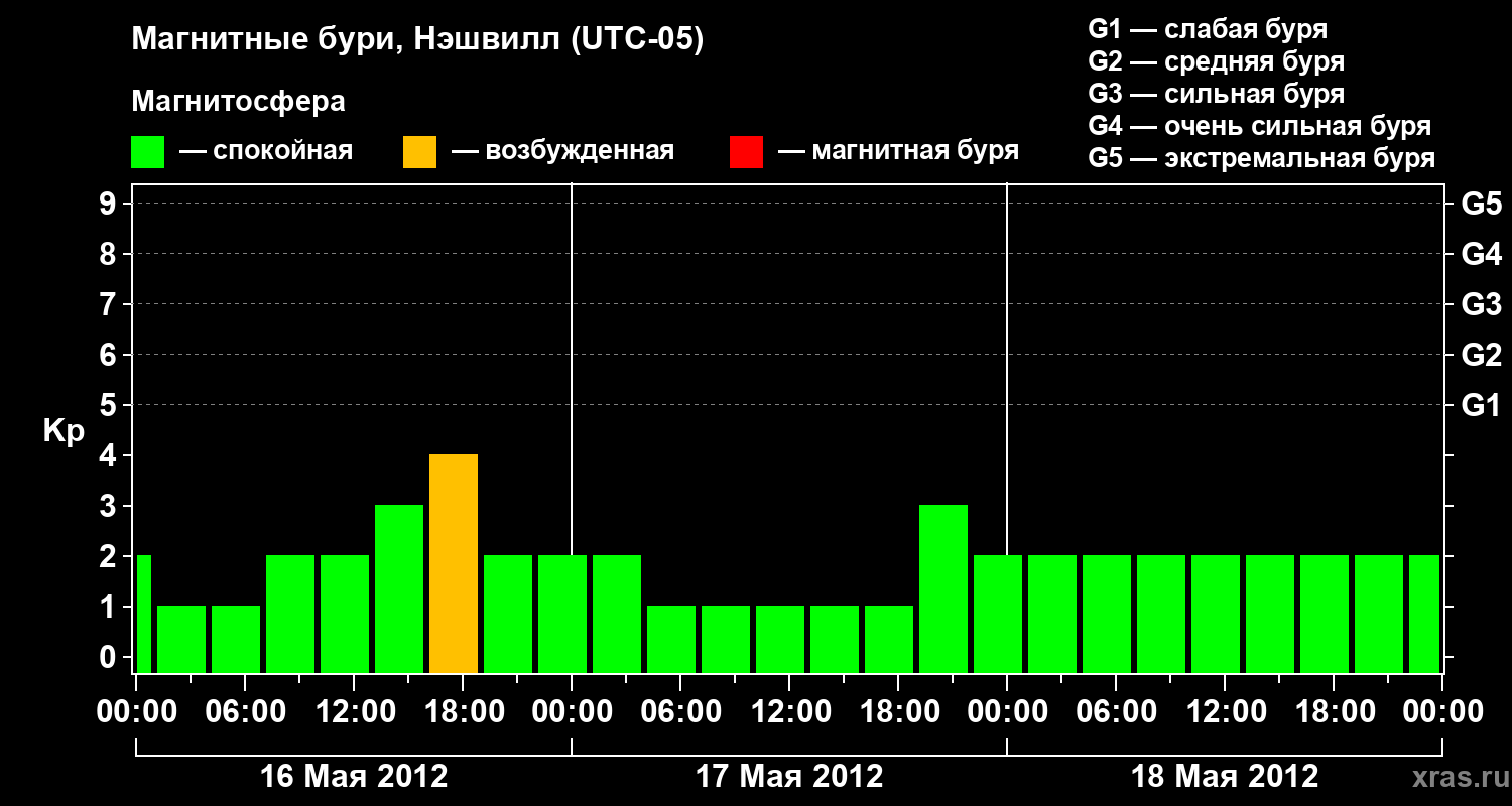 Изменения геомагнитного индекса Kp с 16 по 18 мая 2012 года для средних широт