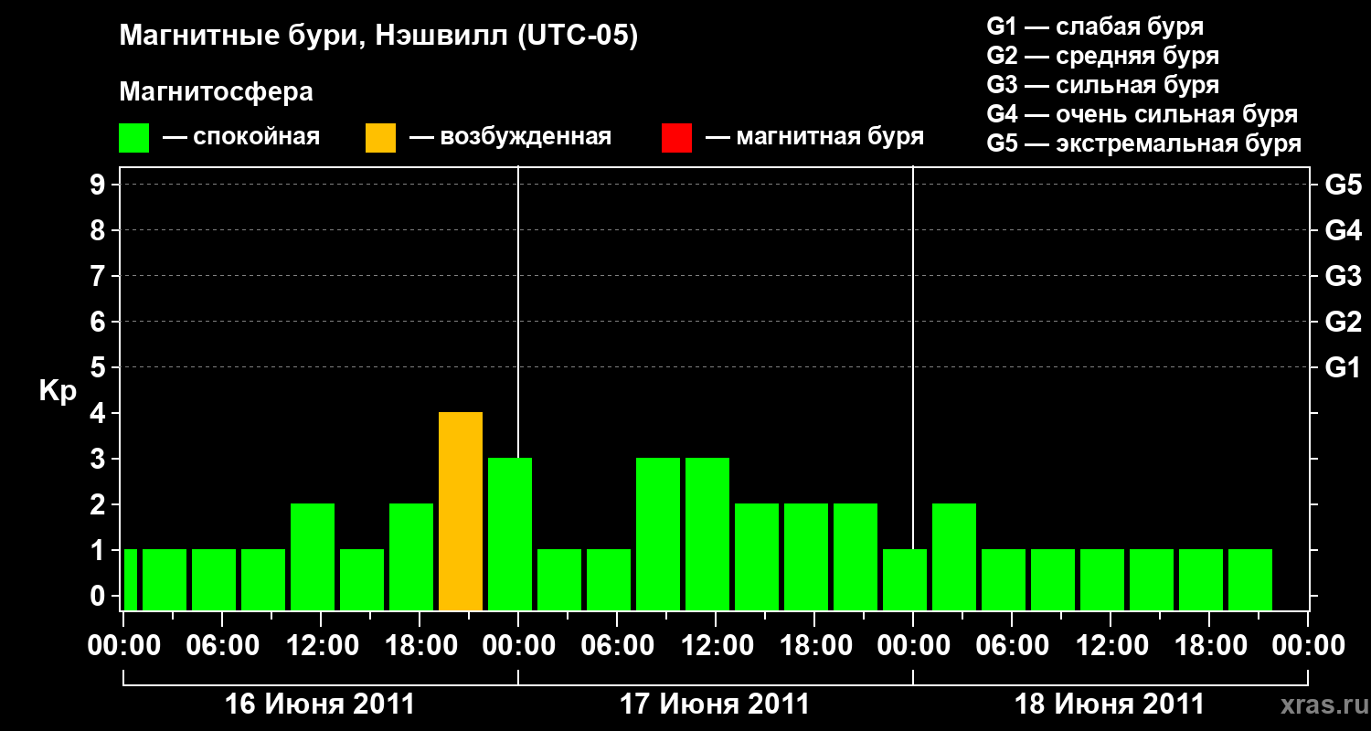 Изменения геомагнитного индекса Kp с 16 по 18 июня 2011 года для средних широт