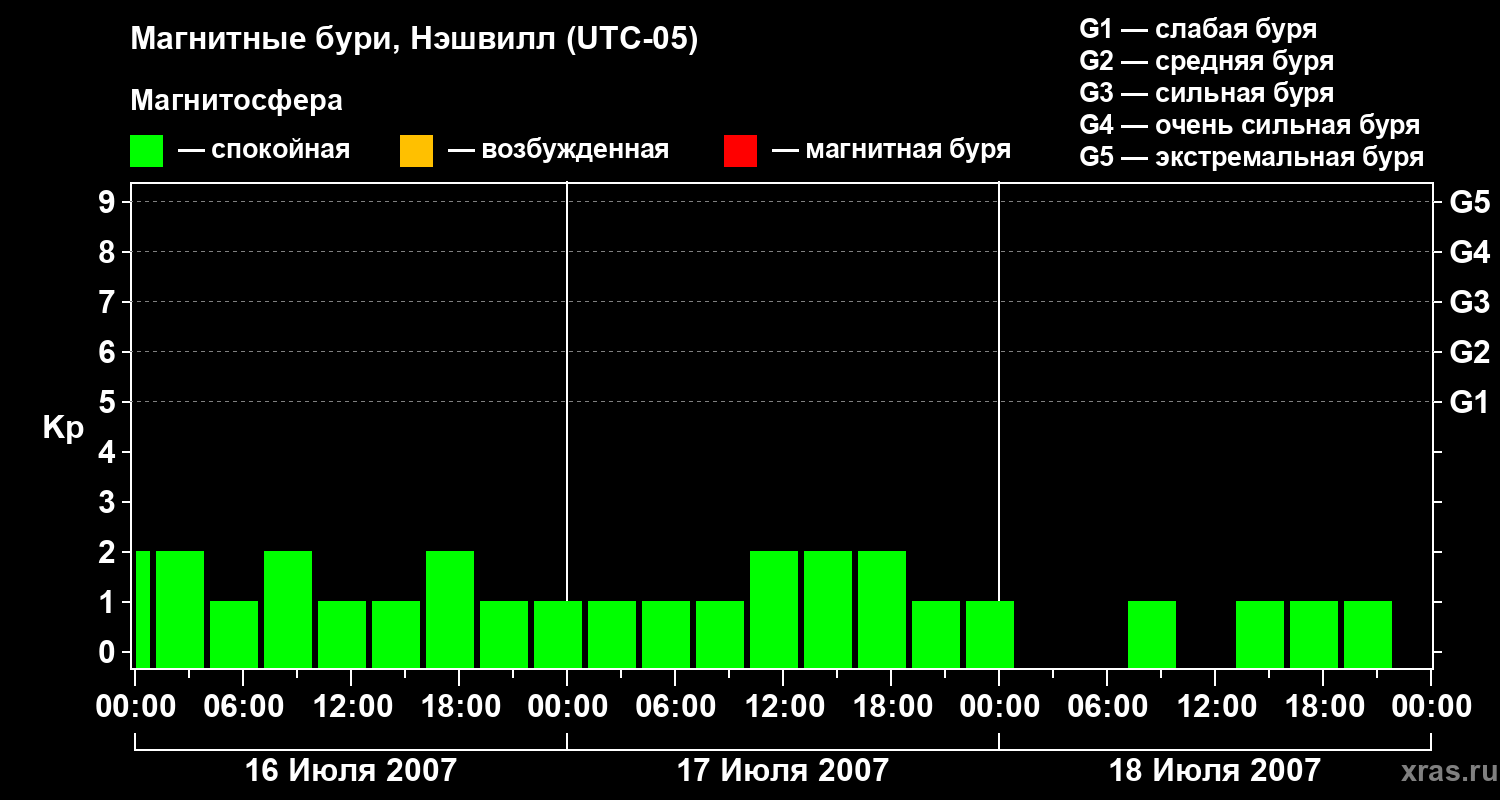 Изменения геомагнитного индекса Kp с 16 по 18 июля 2007 года для средних широт