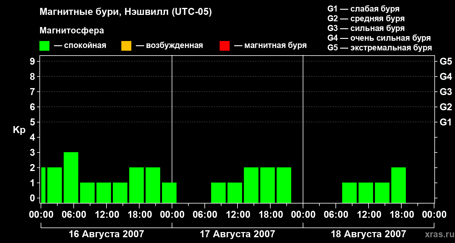 Изменения геомагнитного индекса Kp с 16 по 18 августа 2007 года для средних широт