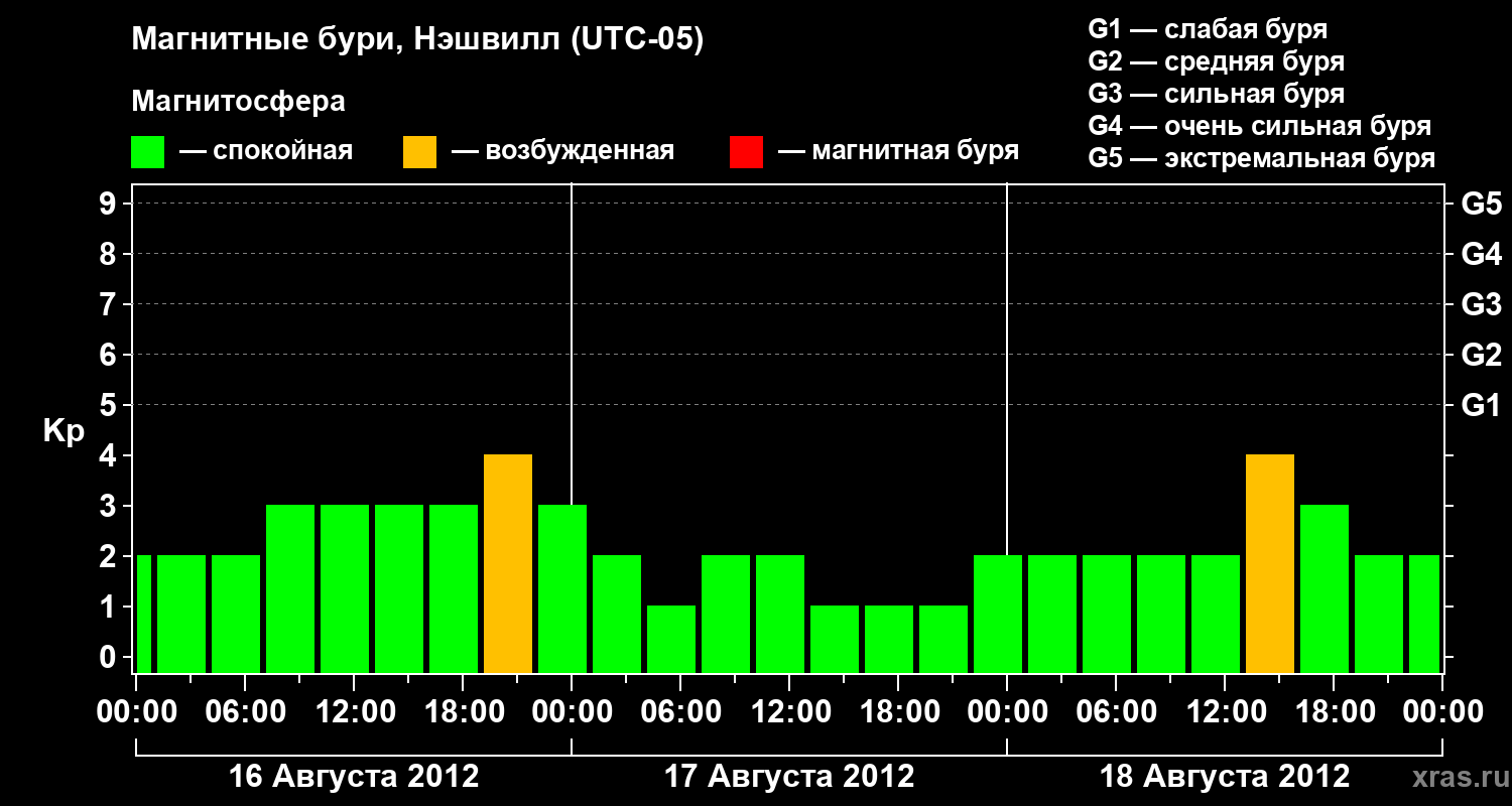 Изменения геомагнитного индекса Kp с 16 по 18 августа 2012 года для средних широт