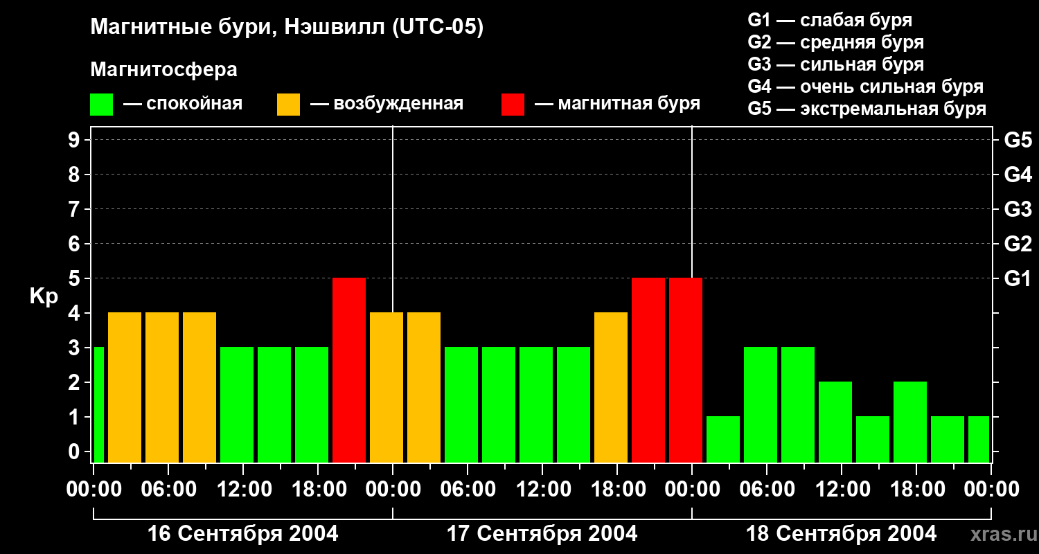 Изменения геомагнитного индекса Kp с 16 по 18 сентября 2004 года для средних широт