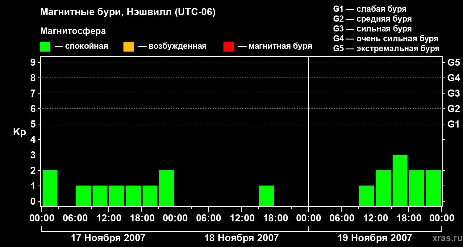 Изменения геомагнитного индекса Kp с 17 по 19 ноября 2007 года для средних широт