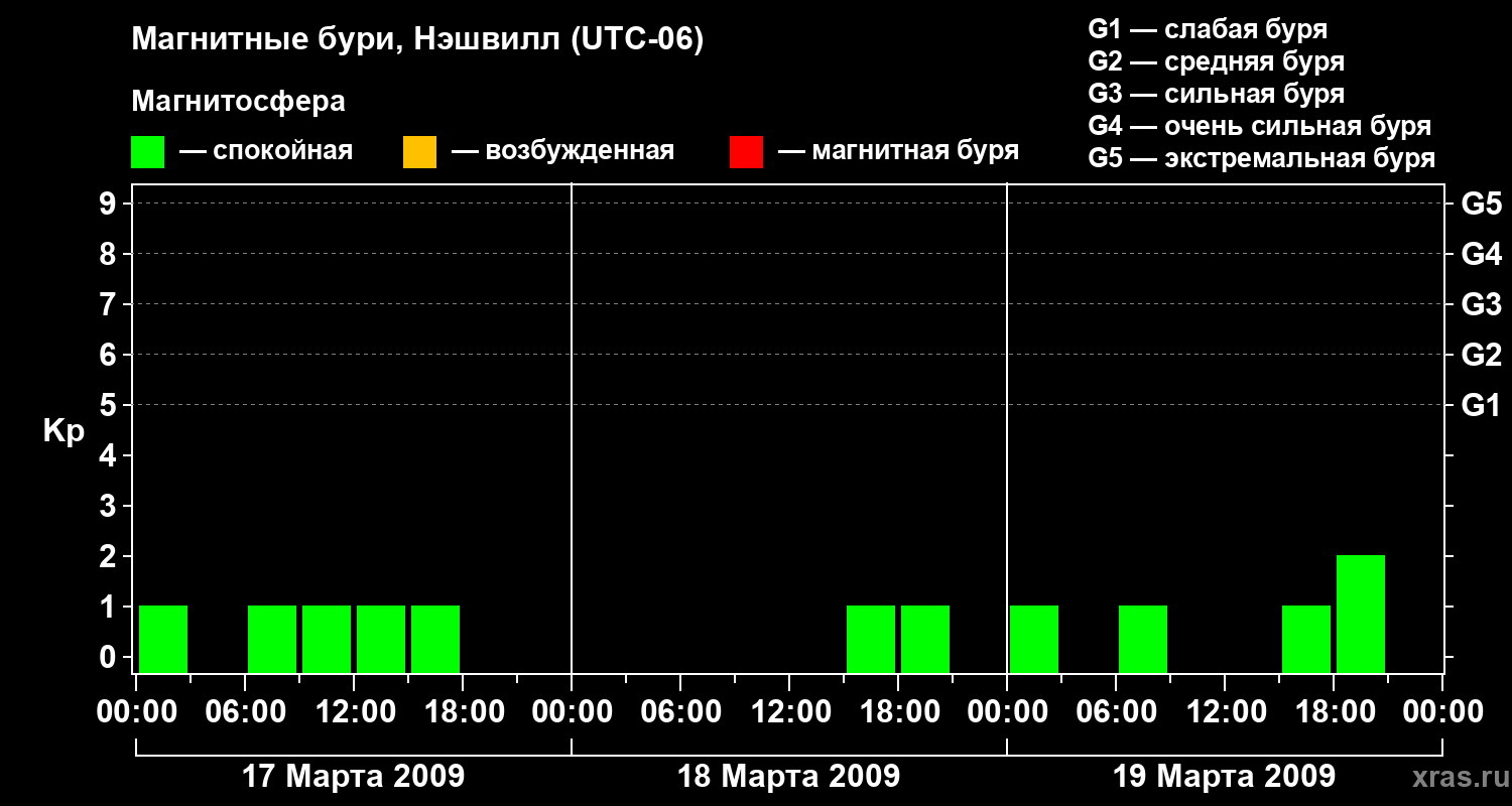 Изменения геомагнитного индекса Kp с 17 по 19 марта 2009 года для средних широт