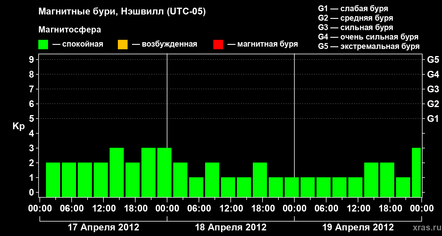 Изменения геомагнитного индекса Kp с 17 по 19 апреля 2012 года для средних широт