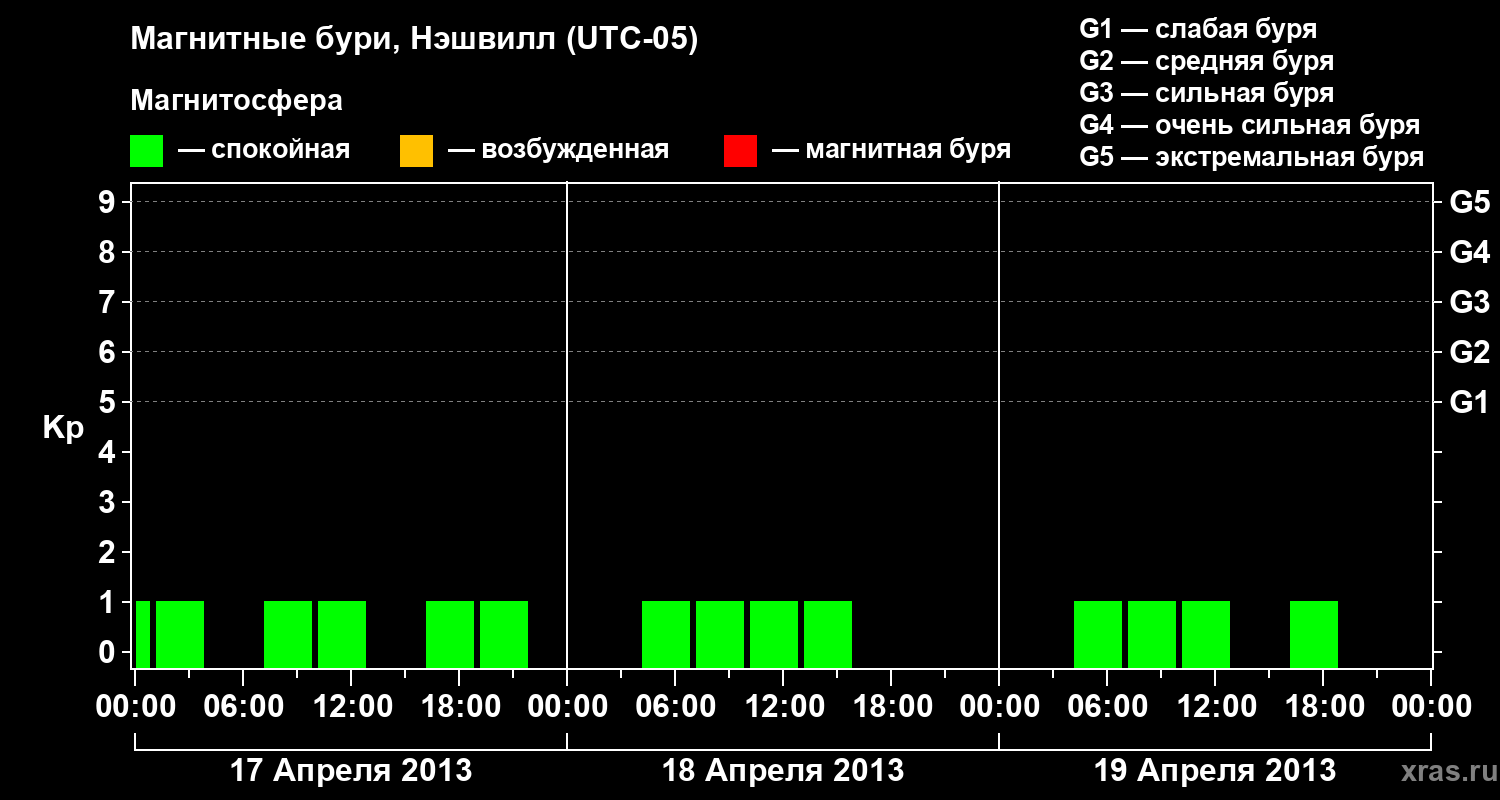 Изменения геомагнитного индекса Kp с 17 по 19 апреля 2013 года для средних широт