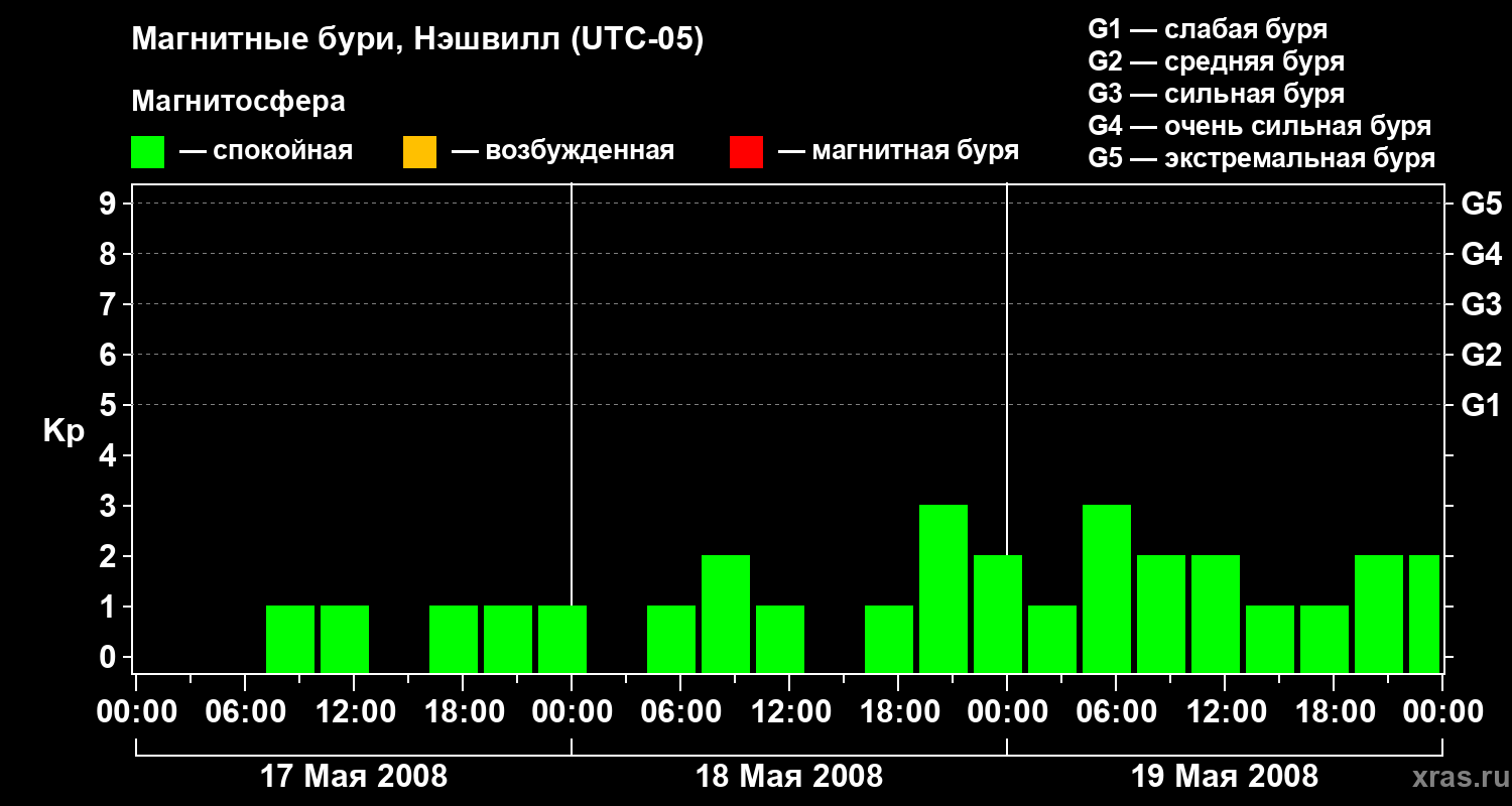 Изменения геомагнитного индекса Kp с 17 по 19 мая 2008 года для средних широт