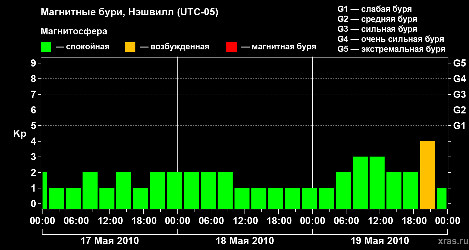 Изменения геомагнитного индекса Kp с 17 по 19 мая 2010 года для средних широт