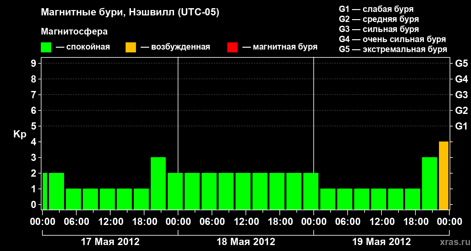 Изменения геомагнитного индекса Kp с 17 по 19 мая 2012 года для средних широт