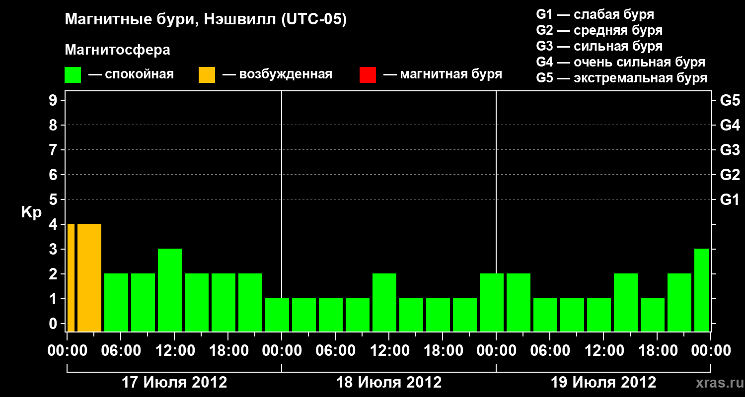 Изменения геомагнитного индекса Kp с 17 по 19 июля 2012 года для средних широт