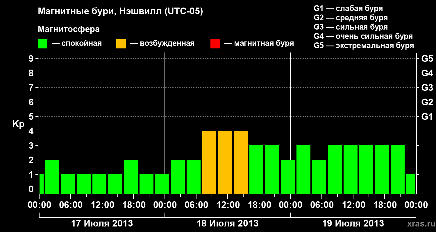 Изменения геомагнитного индекса Kp с 17 по 19 июля 2013 года для средних широт