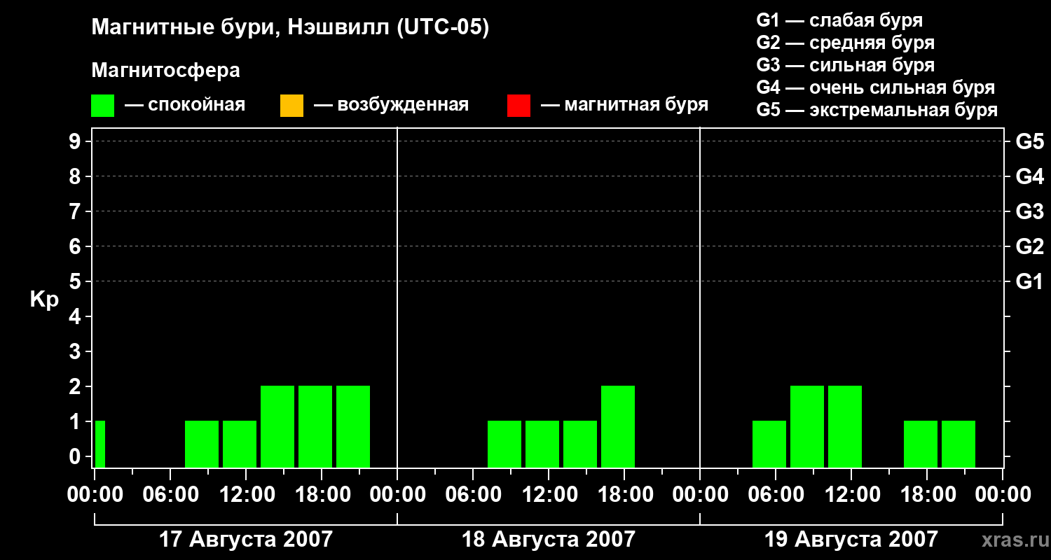Изменения геомагнитного индекса Kp с 17 по 19 августа 2007 года для средних широт
