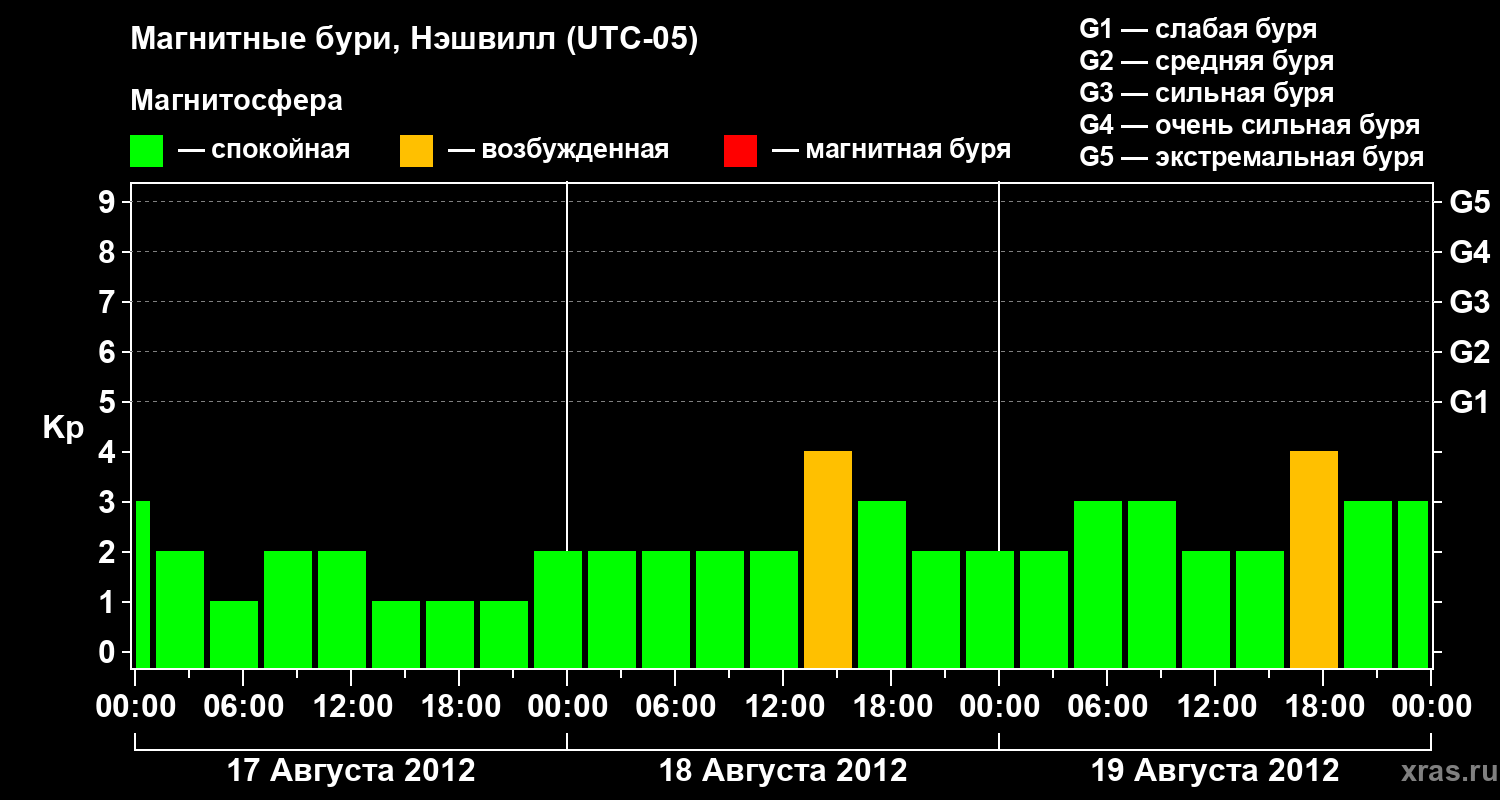 Изменения геомагнитного индекса Kp с 17 по 19 августа 2012 года для средних широт